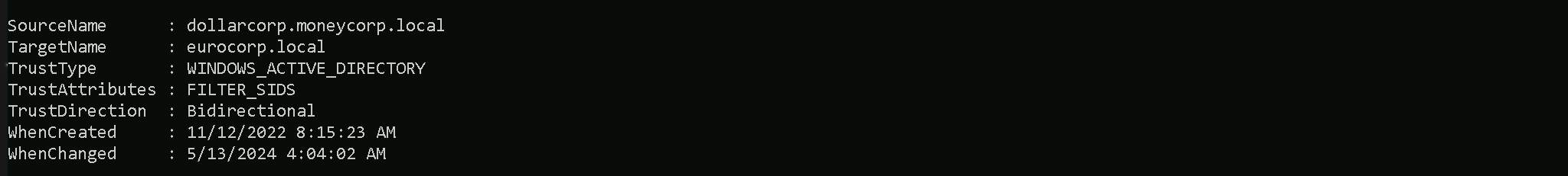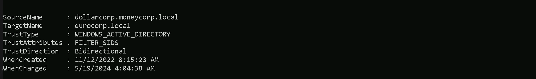 dollarcorp.moneycorp.localinstead of all the trusts. As we can see below, the external trust for dollarcorp iseurocorp.local.Get-DomainTrust | ?{$_.TrustAttributes -eq "FILTER_SIDS"}