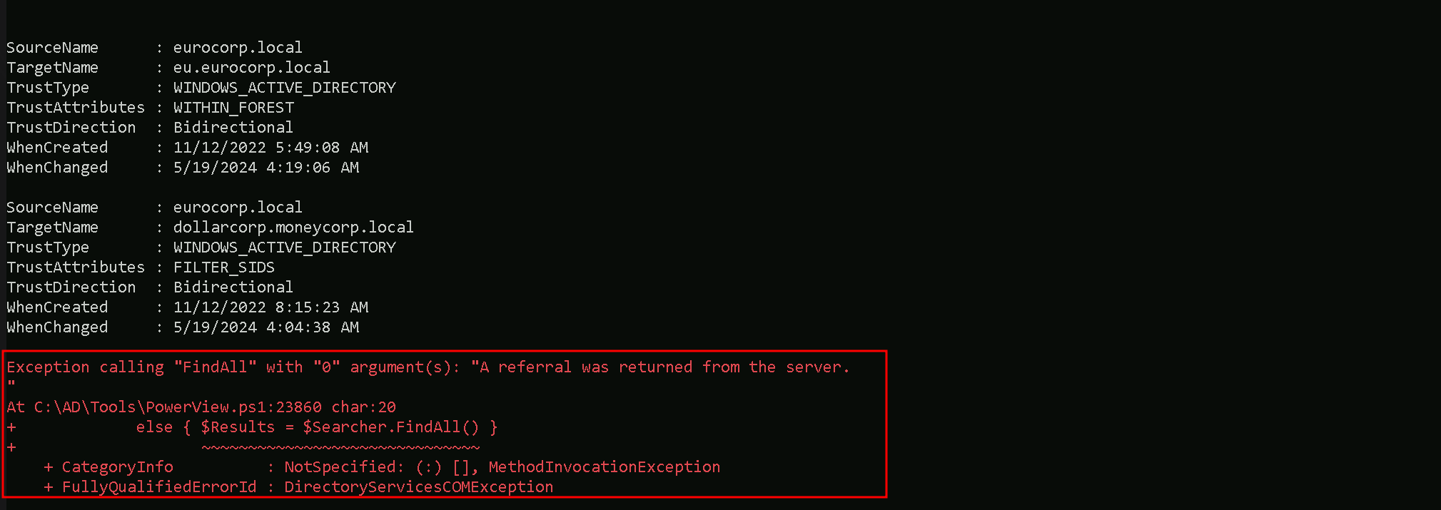 Notice the error above. It occurred because PowerView attempted to list trusts even for
