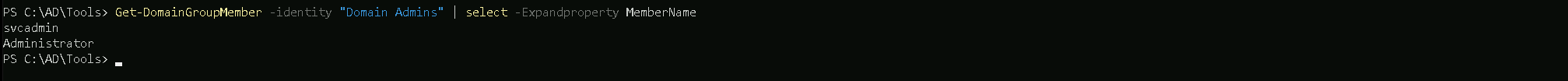 The other thing we can do as well is to filter by MemberName property, this way we will get only all the domain accounts belonging toDomain Adminsgroups.Get-DomainGroupMember -Identity "Domain Admins" | select -ExpandProperty MemberName