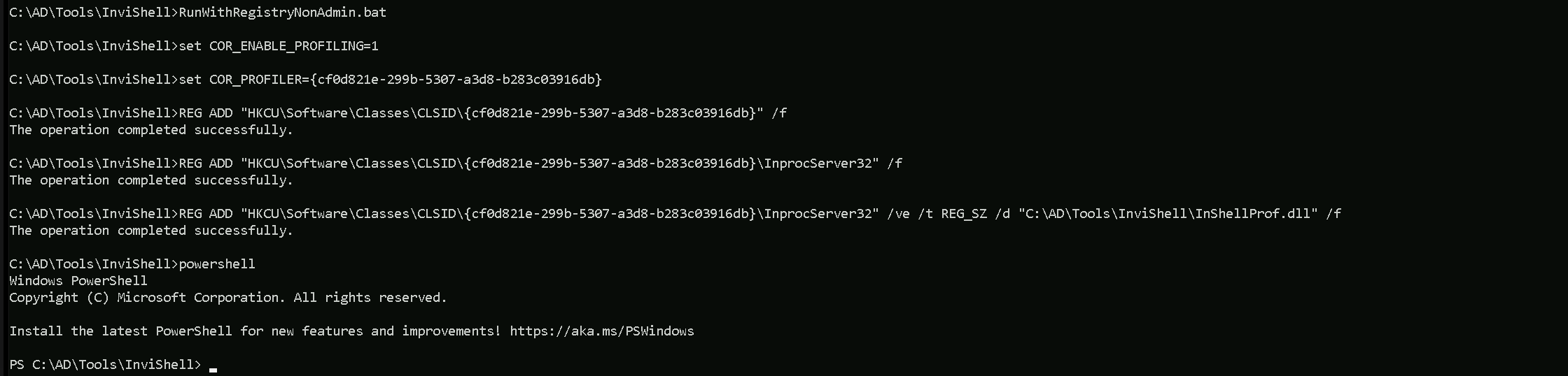 As you can see the output after Invisi-Shell execution, we don’t need to worry about Powershell Detections anymore and PowerShell is called right after.