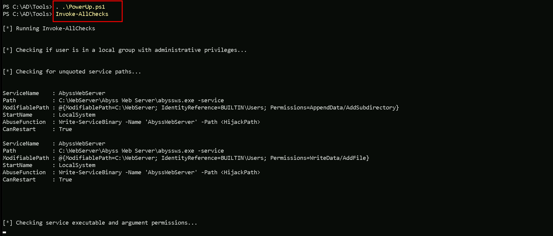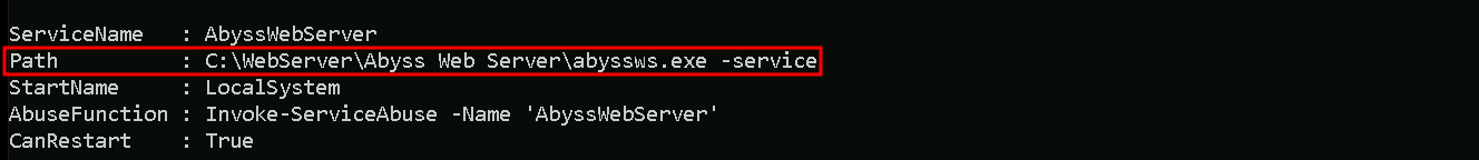It’s also possible to see on the same screenshot that we do have a vulnerability named as “Unquoted Service Path”, and this vulnerability affects service AbyssWebServer.