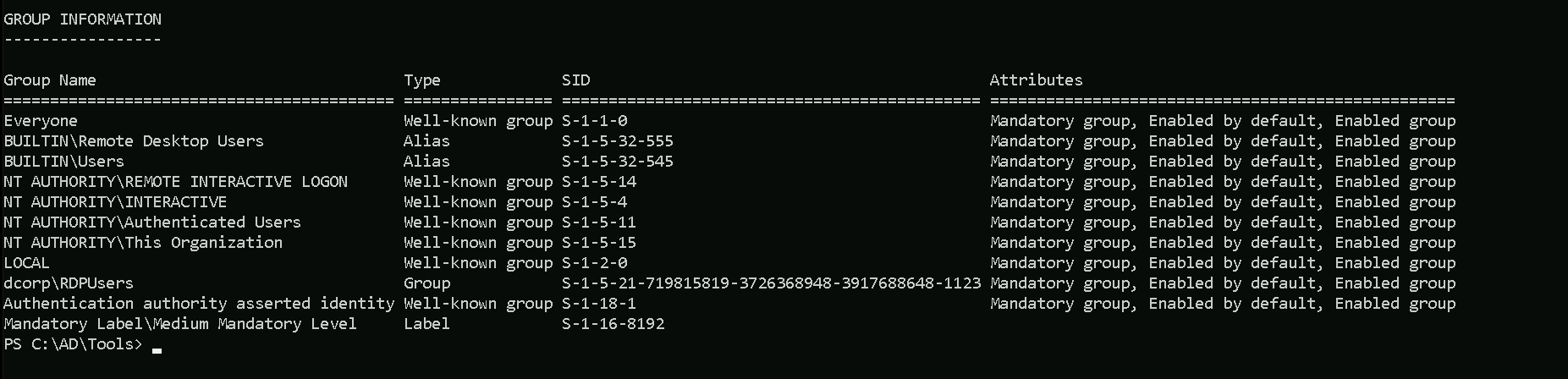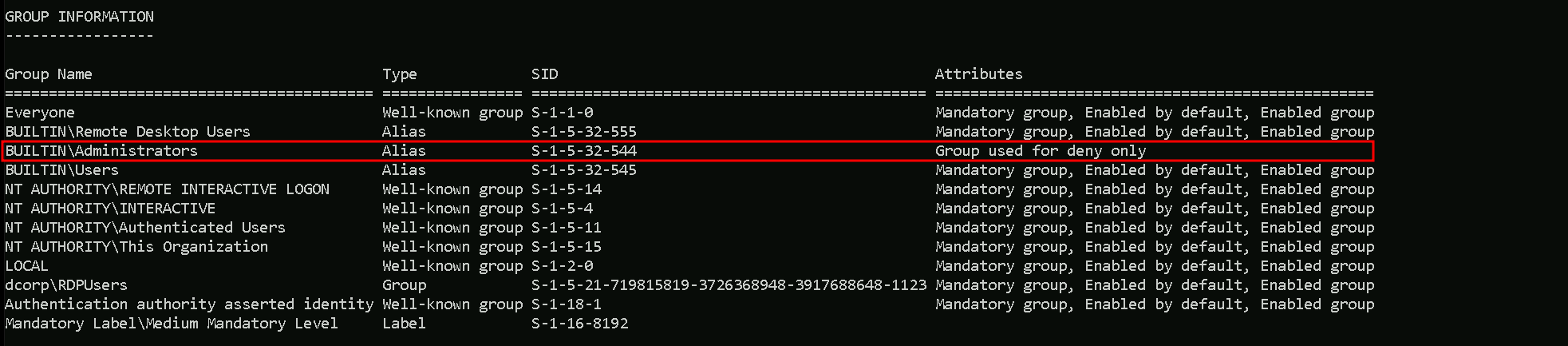 Before logoff and login again.whoami /groups