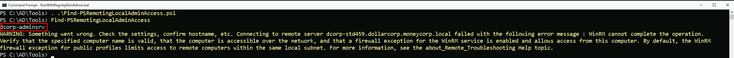 Notice that we had the WARNING message in the screenshot above, it seems that script is trying to connect to the remote machine that we do have local admin remote access and it was not possible to connect.