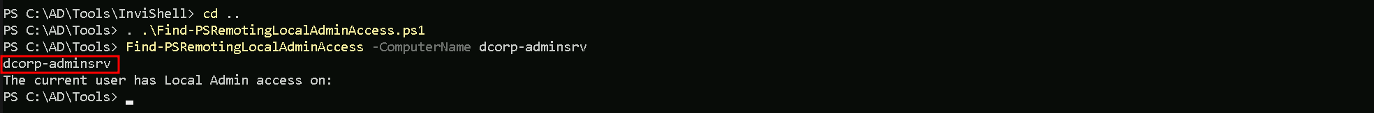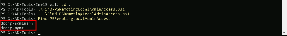 Now as srvadmin, we can check if we have srvadmin has local admin access to any machine in the domain or not, and we can do it using Find-PSRemotingLocalAdmin.ps1 module.