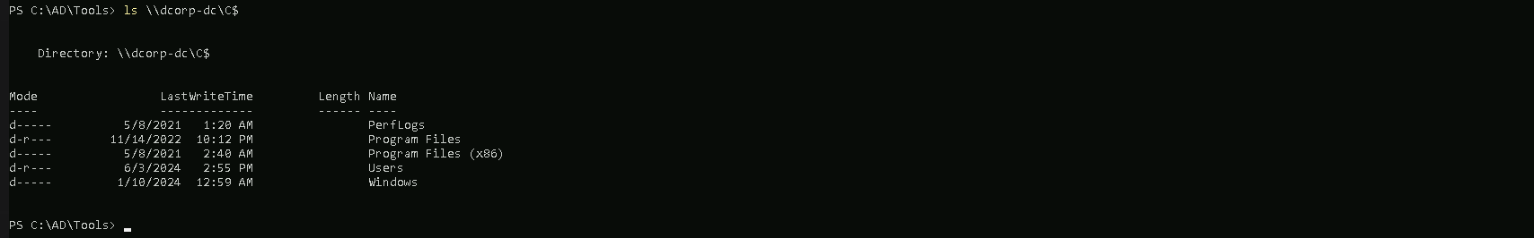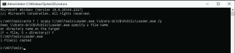echo F | xcopy C:\AD\Tools\Loader.exe \\dcorp-dc\C$\Users\Public\Loader.exe /Y