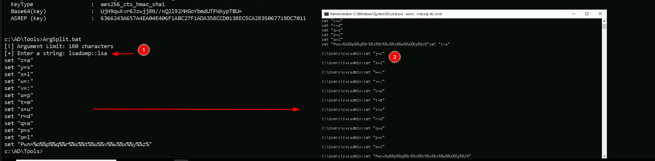 Now let’s use ArgSplit.bat on our attacking machine once again to encode “lsadump::lsa” and copy it to the session with the Domain Admin. as you can see in the screenshot below.