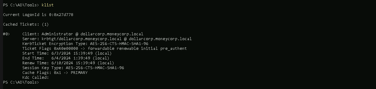 This way we are able to request a new ticket as Administrator and we can see the tickets we have in memory with the command klist.