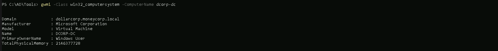 gwmi -Class win32_computersystem -ComputerName dcorp-dc