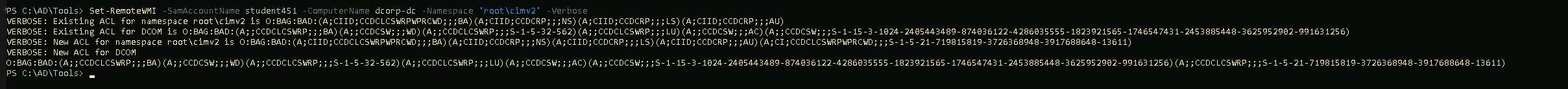 Set-RemoteWMI -SamAccountName student451 -ComputerName dcorp-dc -namespace ‘root\cimv2’ -Verbose