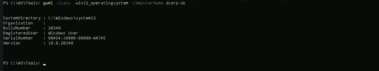gwmi -Class win32_operatingsystem -ComputerName dcorp-dc