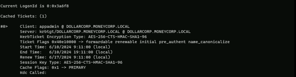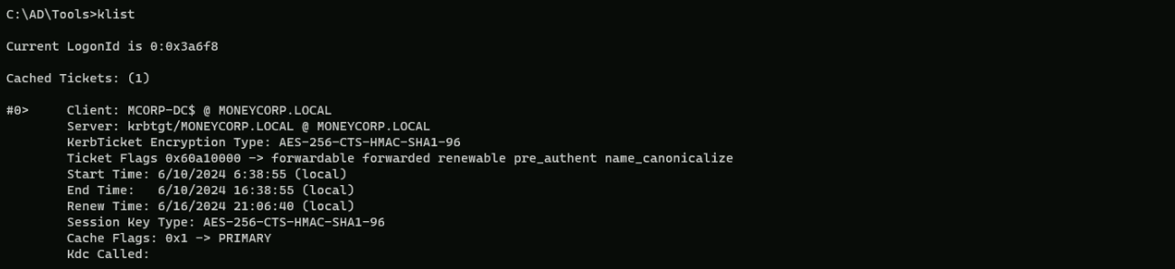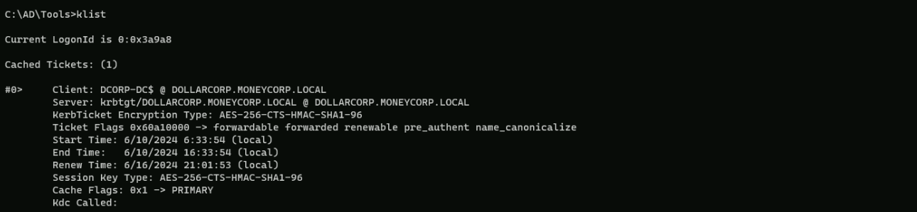 Now if we do a klist to check the Cached Tickets we see that we do have the DCORP-DC$ cached Ticket.