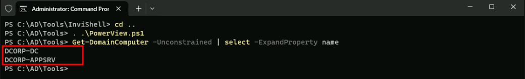 We can use PowerView.ps1 to enumerate machines with Unconstrained Delegation enabled in the domain.