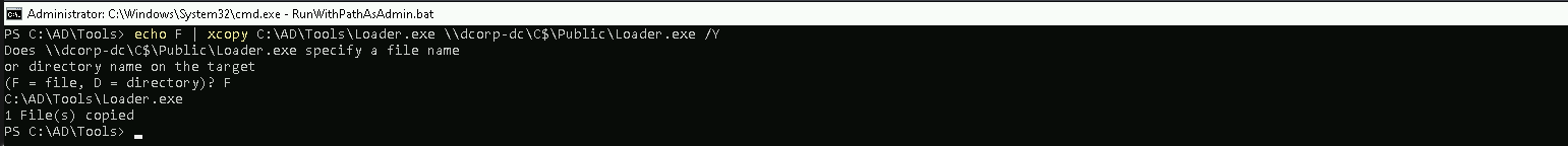 echo F | xcopy C:\AD\Tools\Loader.exe \\dcorp-dc\C$\Public\Loader.exe /Y