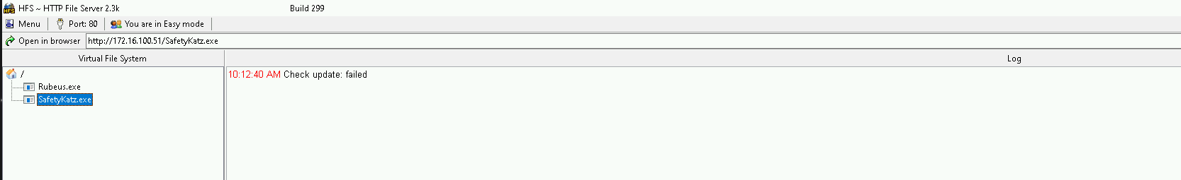 Don’t forget to setup a listener in our target machine, this way the DC can access the SafetyKatz. I’ll be using HFS.exe for now but you can also use python or anything else.