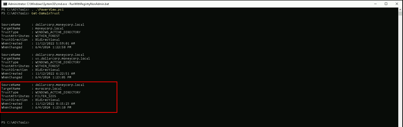 FILTER_SIDS, which means that the SID filtering is enabled for this trust. This means that the SID of the users from the target domain will be filtered to match the SID of the users in the source domain.