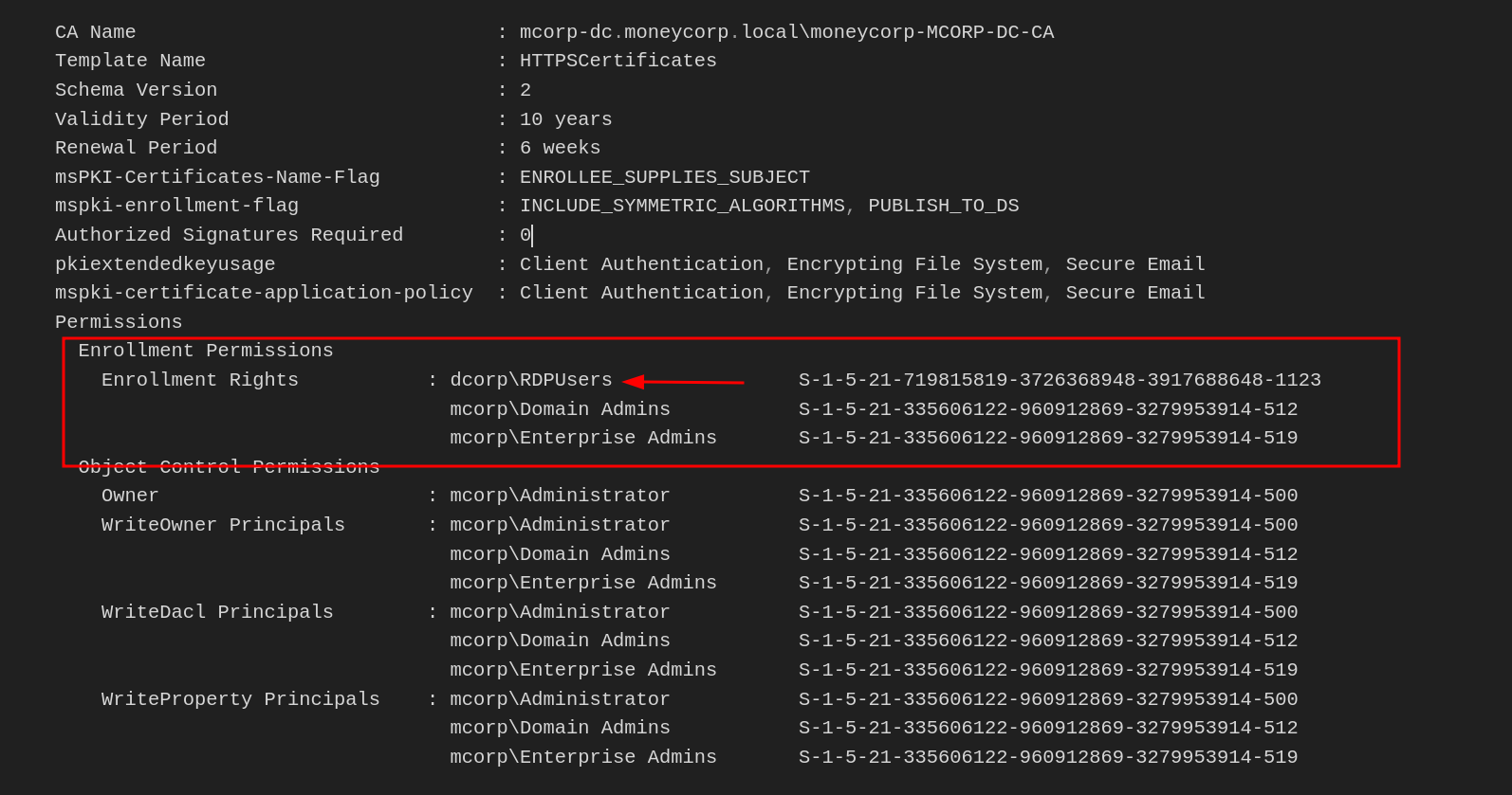 Enrollment Rights : mcorp\Domain Admins S-1-5-21-335606122-960912869-3279953914-512