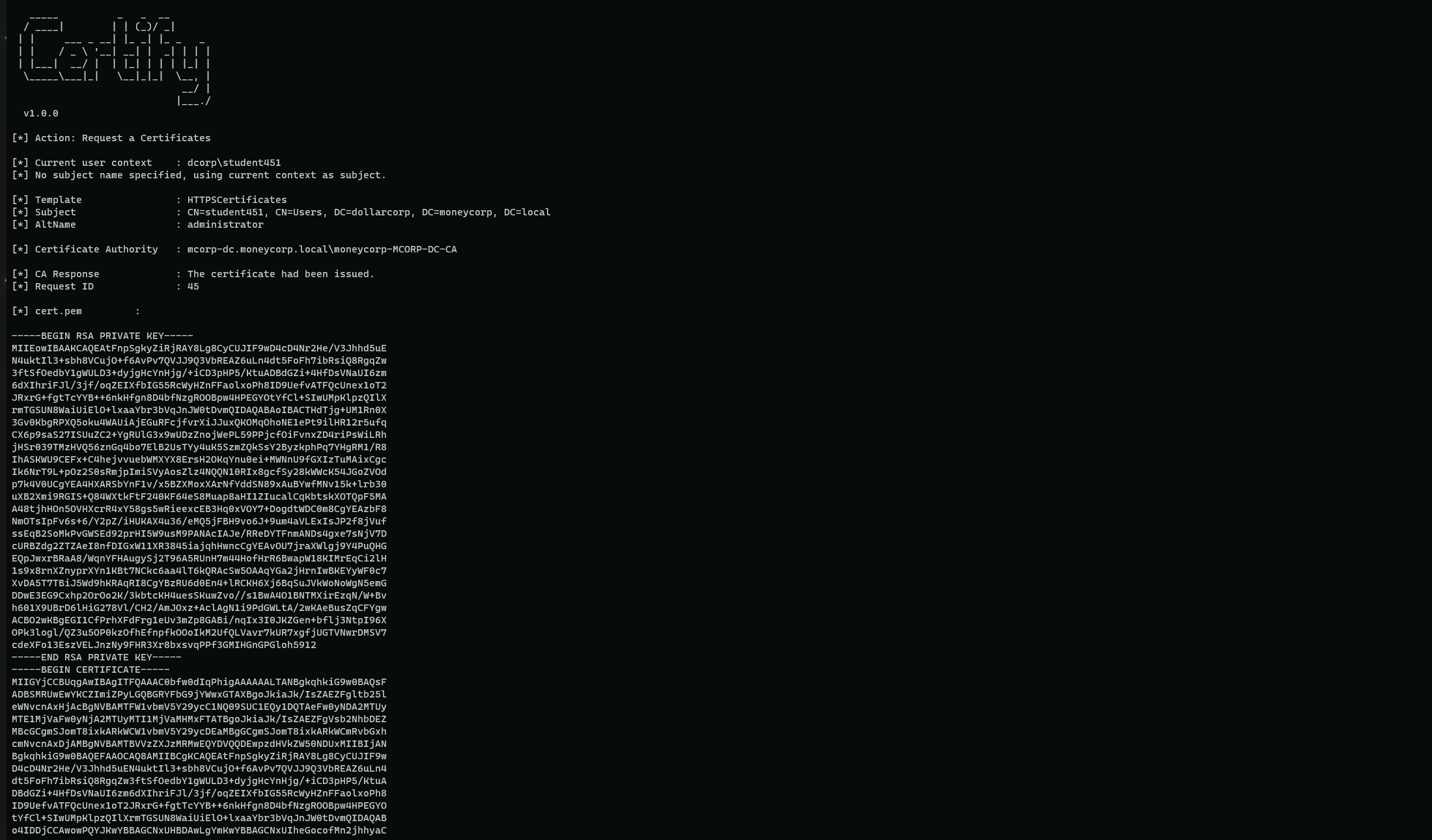 C:\AD\Tools>C:\AD\Tools\Certify.exe request /ca:mcorp-dc.moneycorp.local\moneycorp-MCORP-DC-CA /template:"HTTPSCertificates" /altname:moneycorp.local\administrator