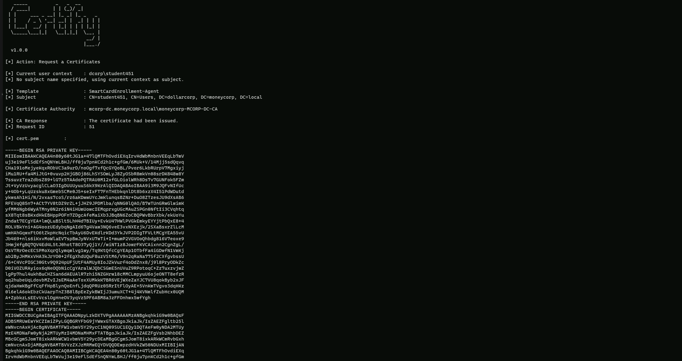 C:\AD\Tools\Certify.exe request /ca:mcorp-dc.moneycorp.local\moneycorp-MCORP-DC-CA /template:SmartCardEnrollment-Agent