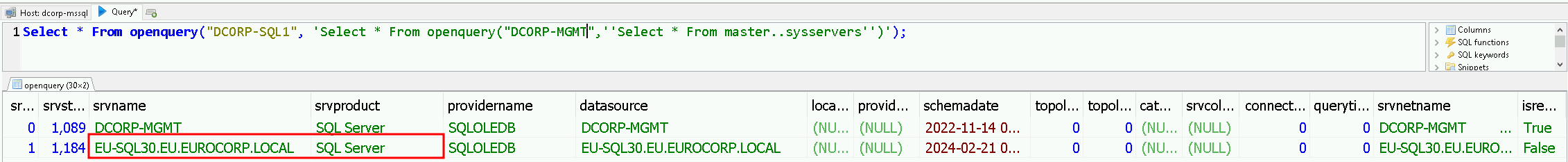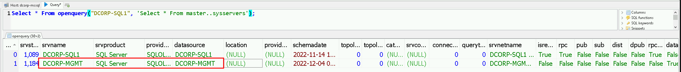 select * from openquery("DCORP-SQL1",'select * from openquery("DCORP-MGMT",''select * from master..sysservers'')')