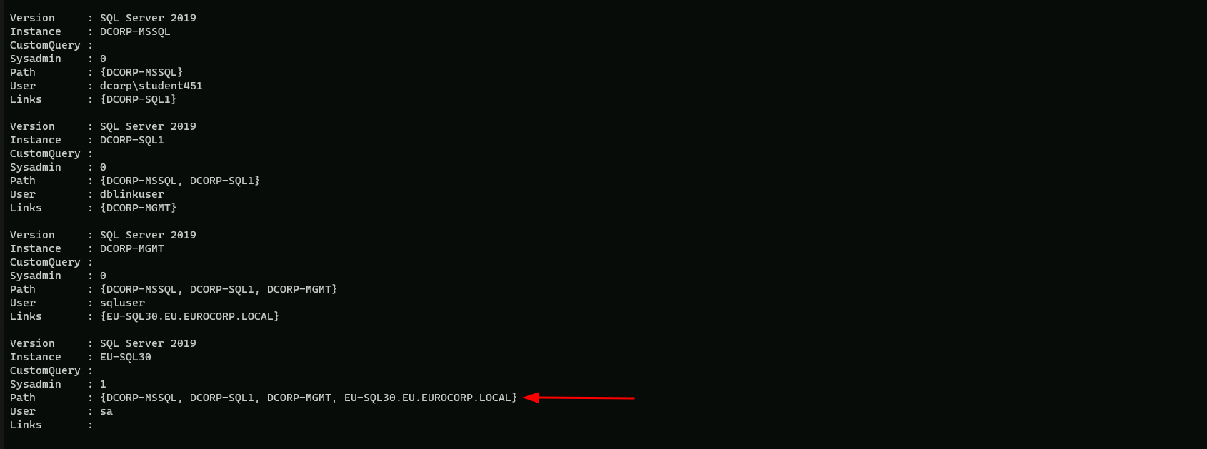 Now we can see that DCORP-MGMT has also a trust link to EU.SQL30, which is another database server on another root forest(eu.eurocorp.local).