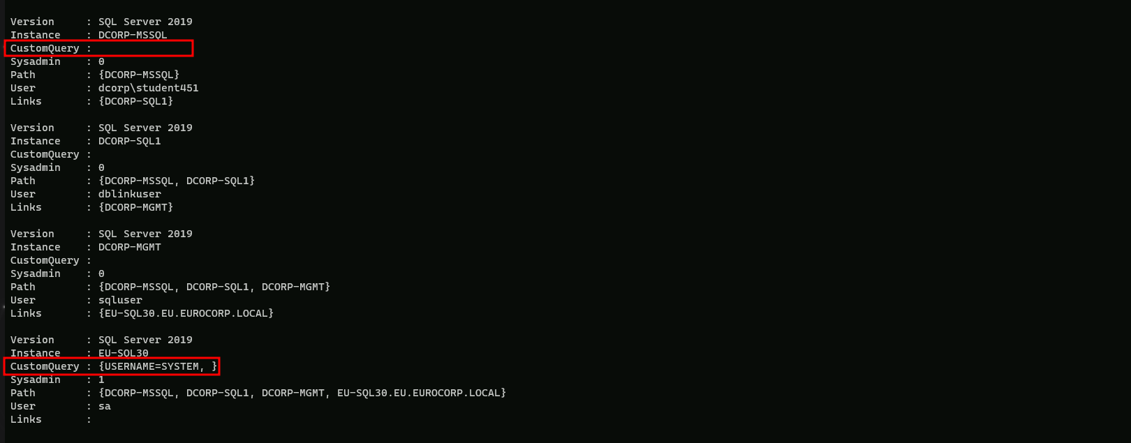 Above we can see that DCORP-MSSQL database has a link to DCORP-SQL1 as well, let’s now do a further enumeration from DCORP-SQL1.