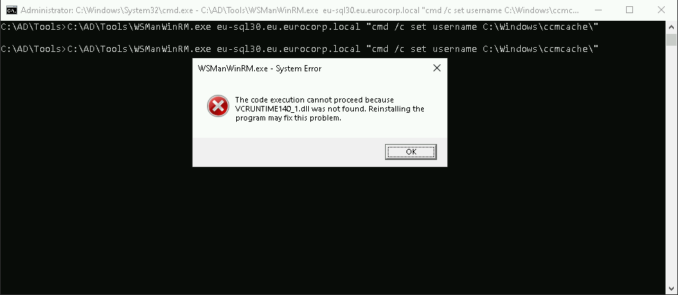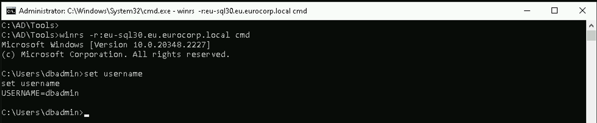 C:\AD\Tools\WSManWinRM.exe eu-sqlx.eu.eurocorp.local "cmd /c set username C:\Windows\ccmcache\"