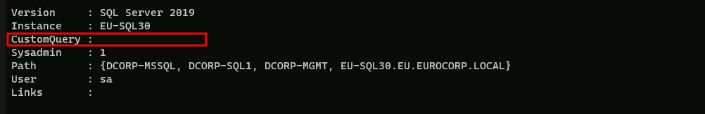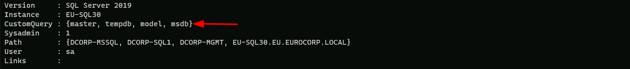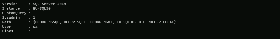 Get-SQLServerLinkCrawl -Instance dcorp-mssql -Query 'SELECT * FROM master.dbo.sysdatabases' -QueryTarget EU-SQL30